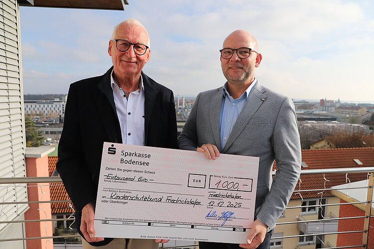 Bildunterschrift: Norbert Büchelmaier, der Vorsitzende des Kinderschutzbundes Friedrichshafen (links), freut sich über die Weihnachtsspende von SWG-Geschäftsführer Alrik von Kolzenberg. Foto: SWG/Alexander Tutschner